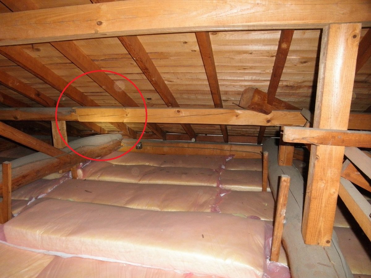 母屋継ぎ手の受けの母屋を支える小屋束が抜けている事例です。