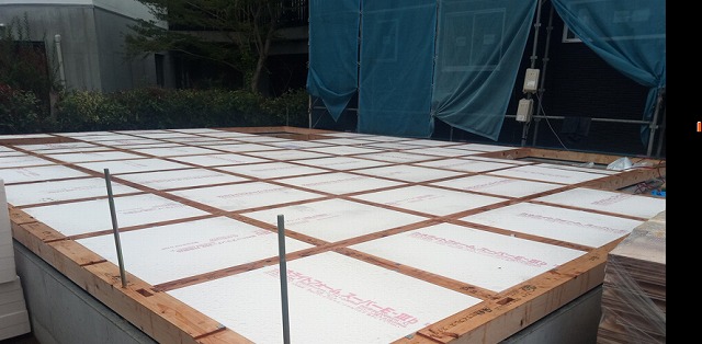 24㎜の厚床合板を敷き並べている時に