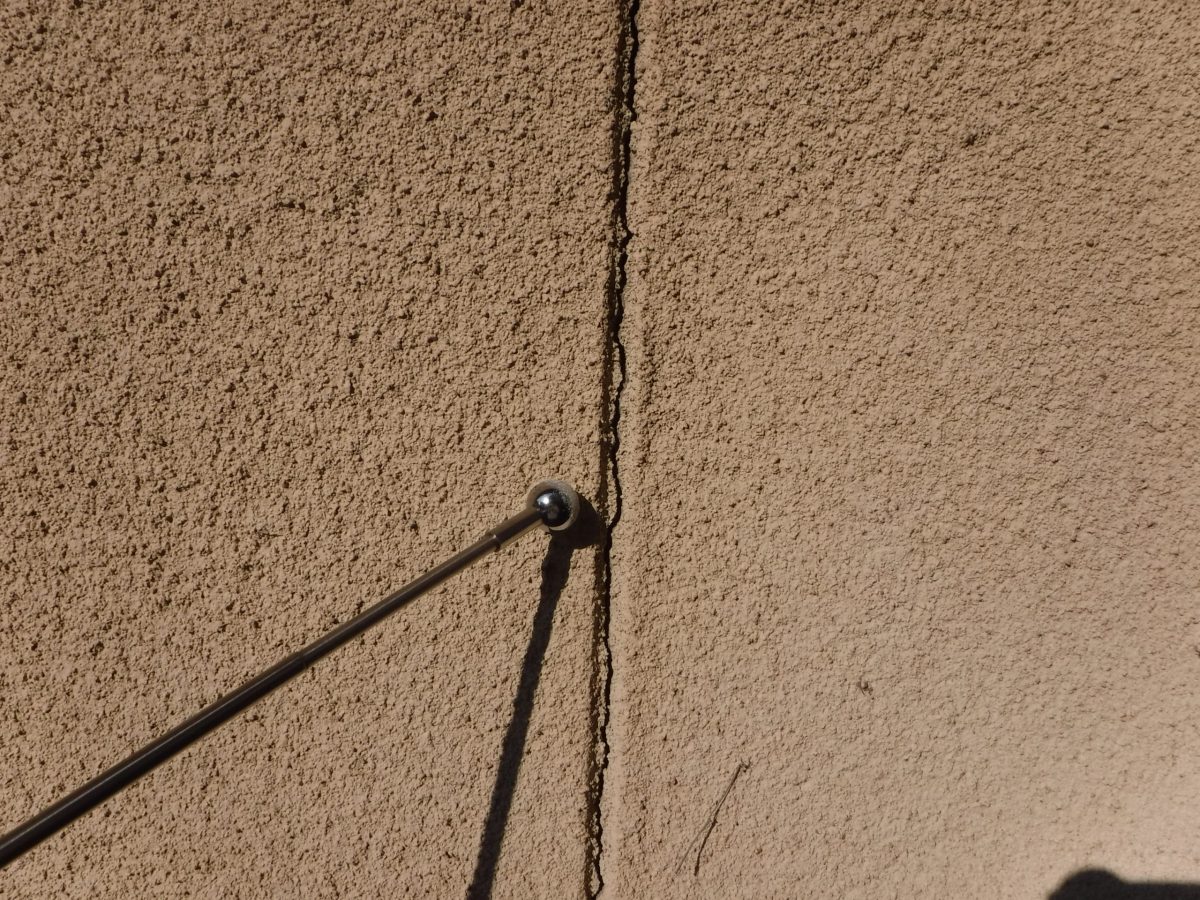 外壁モルタル仕上げの目地部分にひび割れが入っている不適合写真です。